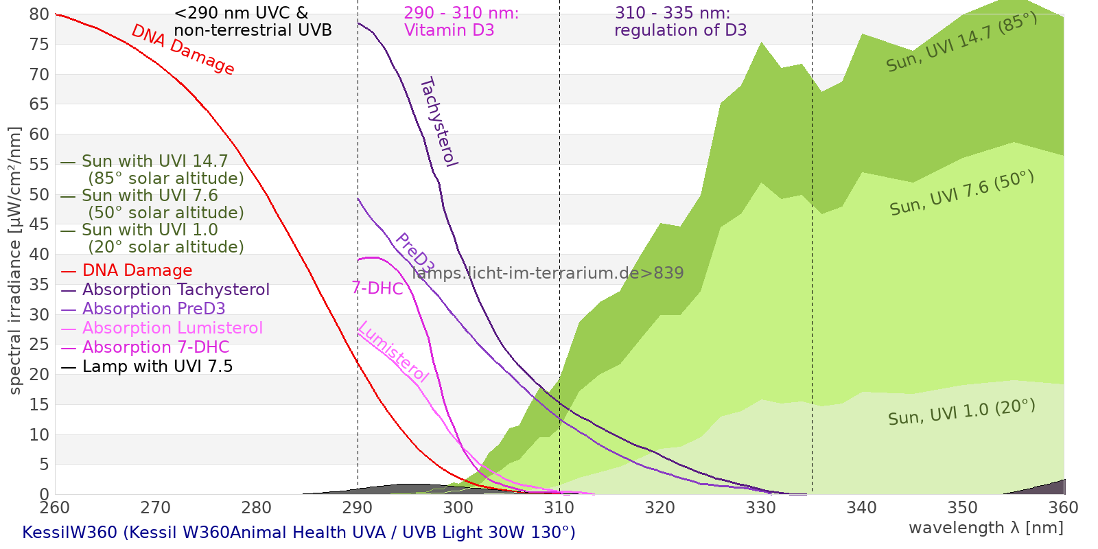 This process prevents any overdose of vitamin D3 from UV radiation with a spectrum similar to sunlight. As a comparison the solar spectra at 20°(id:14) and at 85°(id:21) solar angle are shown.