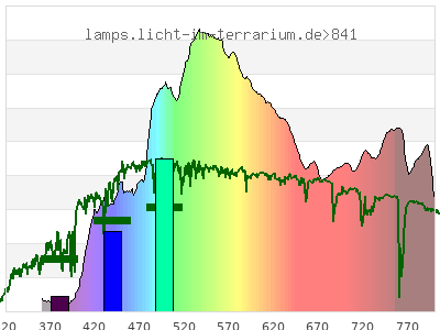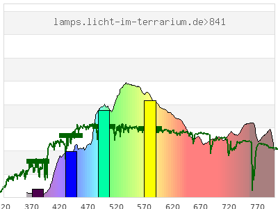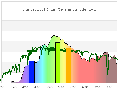 Whereas a spectrometer measures the intensity in every tiny wavelength interval resulting in thousands of individual intensities, the human eye only measures three intensities detected by the three cones. The same is true for the reptile eye with usually three or four photoreceptors. Effectively the detailled spectrum displayed above reduces to a much compacter bar graph displayed below. The photoreceptor sensitivites from these L-Cone, M-Cone, S-Cone, and U-Cone are used, they are chosen as an average of measured reptile photoreceptor sensitivity curves. The bar graph also shows as reference the intensity seen by the three or four photoreceptors for average sunlight (ASTM spectrum).