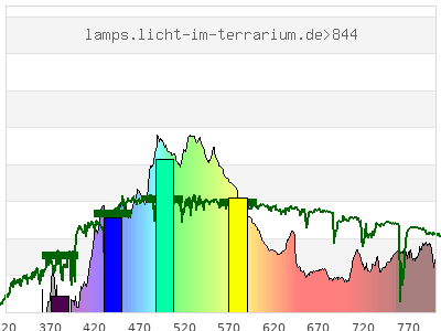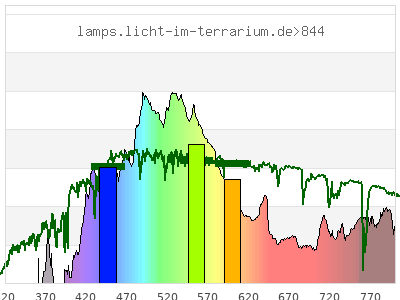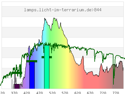 Whereas a spectrometer measures the intensity in every tiny wavelength interval resulting in thousands of individual intensities, the human eye only measures three intensities detected by the three cones. The same is true for the reptile eye with usually three or four photoreceptors. Effectively the detailled spectrum displayed above reduces to a much compacter bar graph displayed below. The photoreceptor sensitivites from these L-Cone, M-Cone, S-Cone, and U-Cone are used, they are chosen as an average of measured reptile photoreceptor sensitivity curves. The bar graph also shows as reference the intensity seen by the three or four photoreceptors for average sunlight (ASTM spectrum).