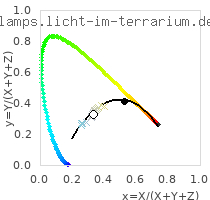 From these three numbers the colour coordinate and the correlated colour temperature for humans are calculated using the CIE standard method. I adapted this concept to a "3 cone reptile (M,S,U)" and a "4 cone reptile (L,M,S,U)". I am sure, that this adaption to other colour spaces makes sense mathematically and this is also done in scientific research regarding colour vision of animals, however I have not seen calculation of colour temperatures for other animals in the scientific literature. Even if it is hypothetical, at least this shows, how arbitrary the colour temperature is, and that the colour temperature calculated for humans does not apply to reptiles. The colour spaces also show the colour coordinates of different phases of daylight ((ids 1, 338 – 451, 511 – 513 ), indicated by crosses, coloured in the appriximate colour perceived by a human.