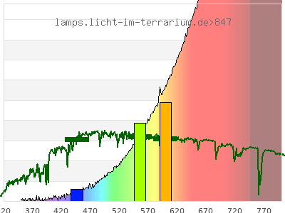 Whereas a spectrometer measures the intensity in every tiny wavelength interval resulting in thousands of individual intensities, the human eye only measures three intensities detected by the three cones. The same is true for the reptile eye with usually three or four photoreceptors. Effectively the detailled spectrum displayed above reduces to a much compacter bar graph displayed below. The photoreceptor sensitivites from these L-Cone, M-Cone, S-Cone, and U-Cone are used, they are chosen as an average of measured reptile photoreceptor sensitivity curves. The bar graph also shows as reference the intensity seen by the three or four photoreceptors for average sunlight (ASTM spectrum).