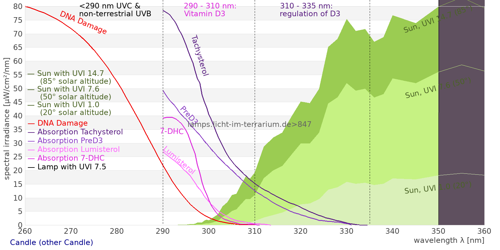 This process prevents any overdose of vitamin D3 from UV radiation with a spectrum similar to sunlight. As a comparison the solar spectra at 20°(id:14) and at 85°(id:21) solar angle are shown.