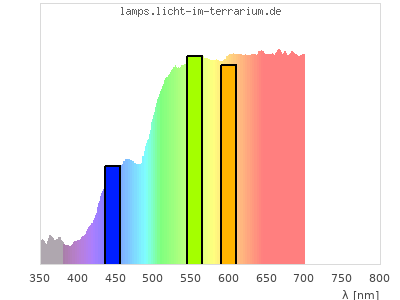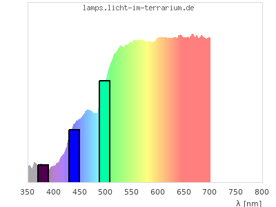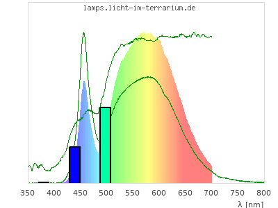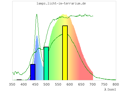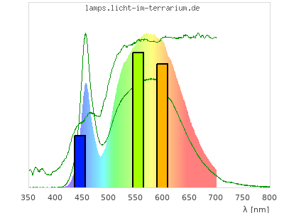 In this second colour calculation, not a light source with constant spectrum, but with a standard LED spectrum (Spectrum id 722) was chosen as reference. The spectrum graph shows the product spectrum of LED light and reflection spectrum and in green the two indivial spectra. For human colour vision the colour should hardly change. For reptiles with UVA colour vision the missing UVA in the LED makes a drastic difference.