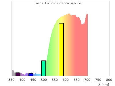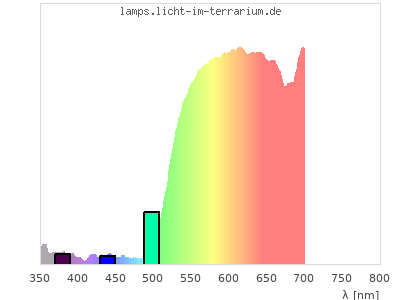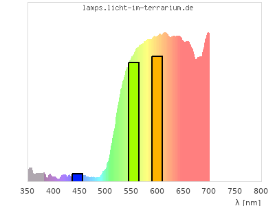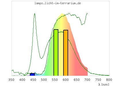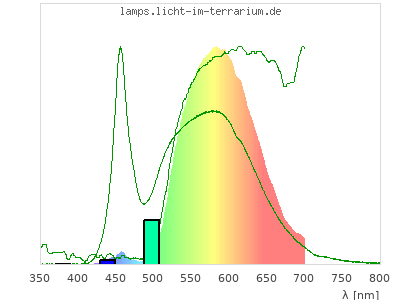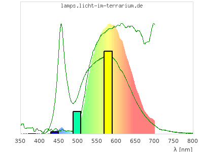 In this second colour calculation, not a light source with constant spectrum, but with a standard LED spectrum (Spectrum id 722) was chosen as reference. The spectrum graph shows the product spectrum of LED light and reflection spectrum and in green the two indivial spectra. For human colour vision the colour should hardly change. For reptiles with UVA colour vision the missing UVA in the LED makes a drastic difference.