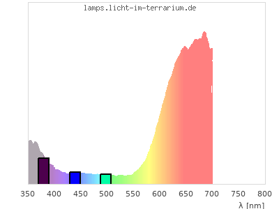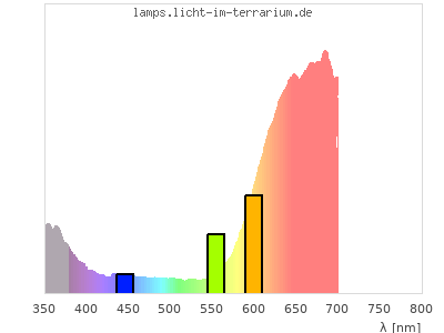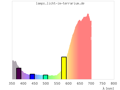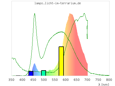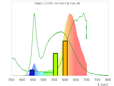 In this second colour calculation, not a light source with constant spectrum, but with a standard LED spectrum (Spectrum id 722) was chosen as reference. The spectrum graph shows the product spectrum of LED light and reflection spectrum and in green the two indivial spectra. For human colour vision the colour should hardly change. For reptiles with UVA colour vision the missing UVA in the LED makes a drastic difference.