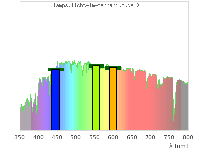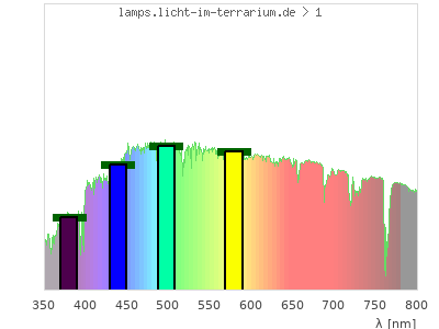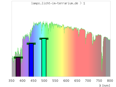 Whereas a spectrometer measures the intensity in every tiny wavelength interval resulting in thousands of individual intensities, the human eye only measures three intensities detected by the three cones. The same is true for the reptile eye with usually three or four photoreceptors. Effectively the detailled spectrum displayed above reduces to a much compacter bar graph displayed below. The photoreceptor sensitivites from these L-Cone, M-Cone, S-Cone, and U-Cone are used, they are chosen as an average of measured reptile photoreceptor sensitivity curves. The bar graph also shows as reference the intensity seen by the three or four photoreceptors for average sunlight (id 1).