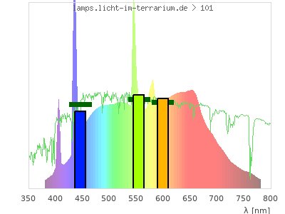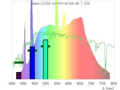 Erythema 0.00184 UV-Index Pyrimidine dimerization of DNA 0 µW/cm² Photoceratitis 0 µW/cm² Photoconjunctivitis 0 µW/cm² DNA Damage 0 Vitamin D3 0 µW/cm² Photosynthesis 2500 µW/cm² Luminosity 10500 lx Human L-Cone 1580 µW/cm² Human M-Cone 1290 µW/cm² Human S-Cone 638 µW/cm² CIE X 1410 µW/cm² CIE Y 1460 µW/cm² CIE Z 1210 µW/cm² PAR PPFD 174 µmol/m²/s Extinction preD3 0 e-3*m²/mol Extinction Tachysterol 0 e-3*m²/mol Exctincition PreD3 0 m²/mol Extinction Lumisterol 0 m²/mol Exctincition Tachysterol 0 m²/mol Extinction 7DHC 0 m²/mol L-Cone 1360 µW/cm² M-Cone 1250 µW/cm² S-Cone 1040 µW/cm² U-Cone 220 µW/cm² UVR - ICNIRP 2004 0.00118 Rel Biol Eff Melatonin Supression 966 µW/cm² Blue Light Hazard 706 µW/cm² (67.1 µW/cm² per 1000 lx) CIE 174:2006 PreVit D3 0 µW/cm² Lumen Reptil 9510 "pseudo-lx" Vitamin D3 Degradation 0 µW/cm² Actinic UV 0.00118 µW/cm² (0.00112 mW/klm) Exctincition Lumisterol 0 m²/mol Exctincition 7DHC 0 m²/mol Exctincition Toxisterols 0 m²/mol