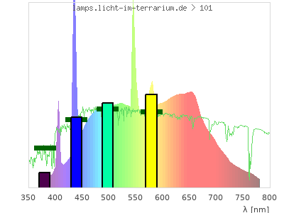 Whereas a spectrometer measures the intensity in every tiny wavelength interval resulting in thousands of individual intensities, the human eye only measures three intensities detected by the three cones. The same is true for the reptile eye with usually three or four photoreceptors. Effectively the detailled spectrum displayed above reduces to a much compacter bar graph displayed below. The photoreceptor sensitivites from these L-Cone, M-Cone, S-Cone, and U-Cone are used, they are chosen as an average of measured reptile photoreceptor sensitivity curves. The bar graph also shows as reference the intensity seen by the three or four photoreceptors for average sunlight (id 1).