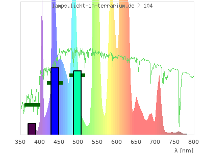 total ( 0 nm - 0 nm) 2970 µW/cm² = 29.7 W/m² UVC ( 0 nm - 280 nm) 0 µW/cm² = 0 W/m² non-terrestrial ( 0 nm - 290 nm) 0 µW/cm² = 0 W/m² total2 ( 250 nm - 880 nm) 2970 µW/cm² = 29.7 W/m² UVB (EU) ( 280 nm - 315 nm) 0 µW/cm² = 0 W/m² UVB (US) ( 280 nm - 320 nm) 0 µW/cm² = 0 W/m² UVA+B ( 280 nm - 380 nm) 0 µW/cm² = 0 W/m² Solar UVB ( 290 nm - 315 nm) 0 µW/cm² = 0 W/m² UVA D3 regulating ( 315 nm - 335 nm) 0 µW/cm² = 0 W/m² UVA (EU) ( 315 nm - 380 nm) 0 µW/cm² = 0 W/m² UVA2 (medical definition) ( 320 nm - 340 nm) 0 µW/cm² = 0 W/m² UVA (US) ( 320 nm - 380 nm) 0 µW/cm² = 0 W/m² UVA1 (variant) ( 335 nm - 380 nm) 0 µW/cm² = 0 W/m² UVA1 (medical) ( 340 nm - 400 nm) 12.3 µW/cm² = 0.123 W/m² vis. UVA ( 350 nm - 380 nm) 0 µW/cm² = 0 W/m² VIS Rep3 ( 350 nm - 600 nm) 1990 µW/cm² = 19.9 W/m² VIS Rep4 ( 350 nm - 700 nm) 2890 µW/cm² = 28.9 W/m² purple ( 380 nm - 420 nm) 102 µW/cm² = 1.02 W/m² VIS ( 380 nm - 780 nm) 2970 µW/cm² = 29.7 W/m² VIS2 ( 400 nm - 680 nm) 2850 µW/cm² = 28.5 W/m² PAR ( 400 nm - 700 nm) 2880 µW/cm² = 28.8 W/m² tmp ( 400 nm - 1100 nm) 2960 µW/cm² = 29.6 W/m² blue ( 420 nm - 490 nm) 635 µW/cm² = 6.35 W/m² green ( 490 nm - 575 nm) 972 µW/cm² = 9.72 W/m² yellow ( 575 nm - 585 nm) 106 µW/cm² = 1.06 W/m² orange ( 585 nm - 650 nm) 972 µW/cm² = 9.72 W/m² red ( 650 nm - 780 nm) 177 µW/cm² = 1.77 W/m² IRA ( 700 nm - 1400 nm) 81 µW/cm² = 0.81 W/m² IR2 ( 720 nm - 1100 nm) 14 µW/cm² = 0.14 W/m² IRB ( 1400 nm - 3000 nm) 0 µW/cm² = 0 W/m²