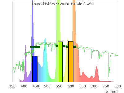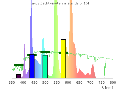 Whereas a spectrometer measures the intensity in every tiny wavelength interval resulting in thousands of individual intensities, the human eye only measures three intensities detected by the three cones. The same is true for the reptile eye with usually three or four photoreceptors. Effectively the detailled spectrum displayed above reduces to a much compacter bar graph displayed below. The photoreceptor sensitivites from these L-Cone, M-Cone, S-Cone, and U-Cone are used, they are chosen as an average of measured reptile photoreceptor sensitivity curves. The bar graph also shows as reference the intensity seen by the three or four photoreceptors for average sunlight (id 1).