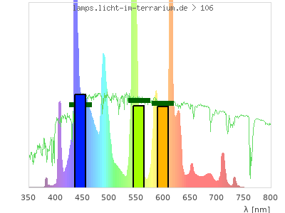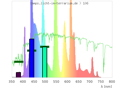 total ( 0 nm - 0 nm) 22400 µW/cm² = 224 W/m² UVC ( 0 nm - 280 nm) 0 µW/cm² = 0 W/m² non-terrestrial ( 0 nm - 290 nm) 0 µW/cm² = 0 W/m² total2 ( 250 nm - 880 nm) 22400 µW/cm² = 224 W/m² UVB (EU) ( 280 nm - 315 nm) 0 µW/cm² = 0 W/m² UVB (US) ( 280 nm - 320 nm) 0 µW/cm² = 0 W/m² UVA+B ( 280 nm - 380 nm) 32.5 µW/cm² = 0.325 W/m² Solar UVB ( 290 nm - 315 nm) 0 µW/cm² = 0 W/m² UVA D3 regulating ( 315 nm - 335 nm) 0 µW/cm² = 0 W/m² UVA (EU) ( 315 nm - 380 nm) 32.5 µW/cm² = 0.325 W/m² UVA2 (medical definition) ( 320 nm - 340 nm) 0 µW/cm² = 0 W/m² UVA (US) ( 320 nm - 380 nm) 32.5 µW/cm² = 0.325 W/m² UVA1 (variant) ( 335 nm - 380 nm) 32.5 µW/cm² = 0.325 W/m² UVA1 (medical) ( 340 nm - 400 nm) 118 µW/cm² = 1.18 W/m² vis. UVA ( 350 nm - 380 nm) 32.5 µW/cm² = 0.325 W/m² VIS Rep3 ( 350 nm - 600 nm) 16900 µW/cm² = 169 W/m² VIS Rep4 ( 350 nm - 700 nm) 21900 µW/cm² = 219 W/m² purple ( 380 nm - 420 nm) 897 µW/cm² = 8.97 W/m² VIS ( 380 nm - 780 nm) 22400 µW/cm² = 224 W/m² VIS2 ( 400 nm - 680 nm) 21600 µW/cm² = 216 W/m² PAR ( 400 nm - 700 nm) 21800 µW/cm² = 218 W/m² tmp ( 400 nm - 1100 nm) 22300 µW/cm² = 223 W/m² blue ( 420 nm - 490 nm) 7070 µW/cm² = 70.7 W/m² green ( 490 nm - 575 nm) 7300 µW/cm² = 73 W/m² yellow ( 575 nm - 585 nm) 611 µW/cm² = 6.11 W/m² orange ( 585 nm - 650 nm) 5280 µW/cm² = 52.8 W/m² red ( 650 nm - 780 nm) 1200 µW/cm² = 12 W/m² IRA ( 700 nm - 1400 nm) 486 µW/cm² = 4.86 W/m² IR2 ( 720 nm - 1100 nm) 110 µW/cm² = 1.1 W/m² IRB ( 1400 nm - 3000 nm) 0 µW/cm² = 0 W/m²