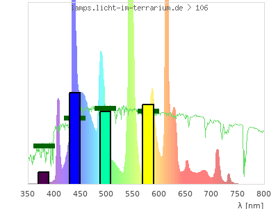 Whereas a spectrometer measures the intensity in every tiny wavelength interval resulting in thousands of individual intensities, the human eye only measures three intensities detected by the three cones. The same is true for the reptile eye with usually three or four photoreceptors. Effectively the detailled spectrum displayed above reduces to a much compacter bar graph displayed below. The photoreceptor sensitivites from these L-Cone, M-Cone, S-Cone, and U-Cone are used, they are chosen as an average of measured reptile photoreceptor sensitivity curves. The bar graph also shows as reference the intensity seen by the three or four photoreceptors for average sunlight (id 1).