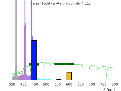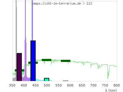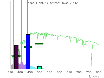 Whereas a spectrometer measures the intensity in every tiny wavelength interval resulting in thousands of individual intensities, the human eye only measures three intensities detected by the three cones. The same is true for the reptile eye with usually three or four photoreceptors. Effectively the detailled spectrum displayed above reduces to a much compacter bar graph displayed below. The photoreceptor sensitivites from these L-Cone, M-Cone, S-Cone, and U-Cone are used, they are chosen as an average of measured reptile photoreceptor sensitivity curves. The bar graph also shows as reference the intensity seen by the three or four photoreceptors for average sunlight (id 1).
