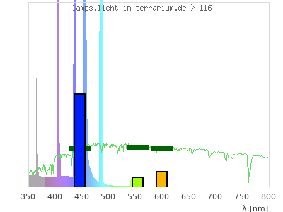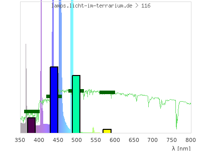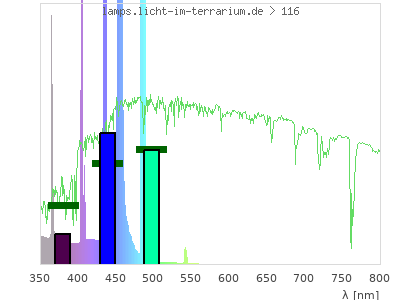 Whereas a spectrometer measures the intensity in every tiny wavelength interval resulting in thousands of individual intensities, the human eye only measures three intensities detected by the three cones. The same is true for the reptile eye with usually three or four photoreceptors. Effectively the detailled spectrum displayed above reduces to a much compacter bar graph displayed below. The photoreceptor sensitivites from these L-Cone, M-Cone, S-Cone, and U-Cone are used, they are chosen as an average of measured reptile photoreceptor sensitivity curves. The bar graph also shows as reference the intensity seen by the three or four photoreceptors for average sunlight (id 1).