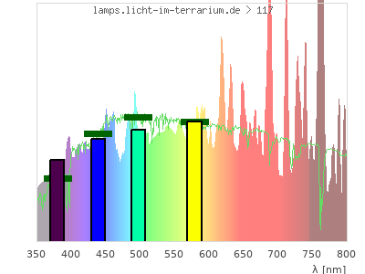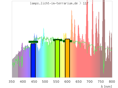 Whereas a spectrometer measures the intensity in every tiny wavelength interval resulting in thousands of individual intensities, the human eye only measures three intensities detected by the three cones. The same is true for the reptile eye with usually three or four photoreceptors. Effectively the detailled spectrum displayed above reduces to a much compacter bar graph displayed below. The photoreceptor sensitivites from these L-Cone, M-Cone, S-Cone, and U-Cone are used, they are chosen as an average of measured reptile photoreceptor sensitivity curves. The bar graph also shows as reference the intensity seen by the three or four photoreceptors for average sunlight (id 1).