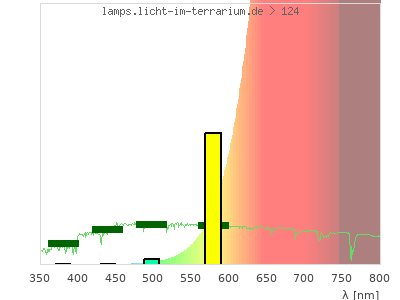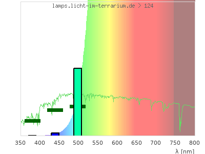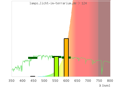 Whereas a spectrometer measures the intensity in every tiny wavelength interval resulting in thousands of individual intensities, the human eye only measures three intensities detected by the three cones. The same is true for the reptile eye with usually three or four photoreceptors. Effectively the detailled spectrum displayed above reduces to a much compacter bar graph displayed below. The photoreceptor sensitivites from these L-Cone, M-Cone, S-Cone, and U-Cone are used, they are chosen as an average of measured reptile photoreceptor sensitivity curves. The bar graph also shows as reference the intensity seen by the three or four photoreceptors for average sunlight (id 1).