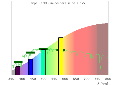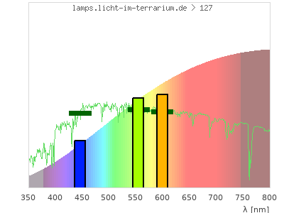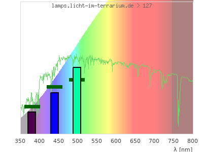 Whereas a spectrometer measures the intensity in every tiny wavelength interval resulting in thousands of individual intensities, the human eye only measures three intensities detected by the three cones. The same is true for the reptile eye with usually three or four photoreceptors. Effectively the detailled spectrum displayed above reduces to a much compacter bar graph displayed below. The photoreceptor sensitivites from these L-Cone, M-Cone, S-Cone, and U-Cone are used, they are chosen as an average of measured reptile photoreceptor sensitivity curves. The bar graph also shows as reference the intensity seen by the three or four photoreceptors for average sunlight (id 1).