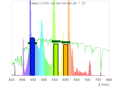 Whereas a spectrometer measures the intensity in every tiny wavelength interval resulting in thousands of individual intensities, the human eye only measures three intensities detected by the three cones. The same is true for the reptile eye with usually three or four photoreceptors. Effectively the detailled spectrum displayed above reduces to a much compacter bar graph displayed below. The photoreceptor sensitivites from these L-Cone, M-Cone, S-Cone, and U-Cone are used, they are chosen as an average of measured reptile photoreceptor sensitivity curves. The bar graph also shows as reference the intensity seen by the three or four photoreceptors for average sunlight (id 1).