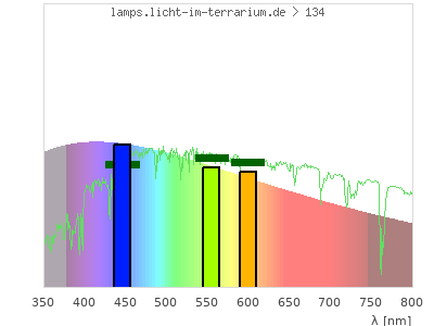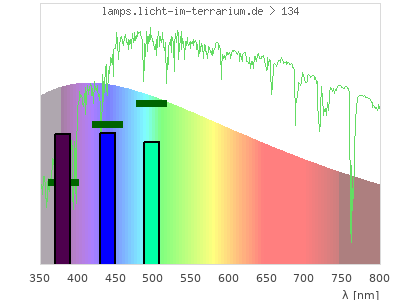 Whereas a spectrometer measures the intensity in every tiny wavelength interval resulting in thousands of individual intensities, the human eye only measures three intensities detected by the three cones. The same is true for the reptile eye with usually three or four photoreceptors. Effectively the detailled spectrum displayed above reduces to a much compacter bar graph displayed below. The photoreceptor sensitivites from these L-Cone, M-Cone, S-Cone, and U-Cone are used, they are chosen as an average of measured reptile photoreceptor sensitivity curves. The bar graph also shows as reference the intensity seen by the three or four photoreceptors for average sunlight (id 1).