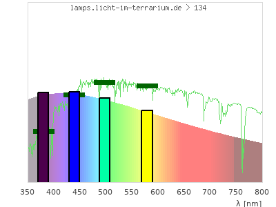 total ( 0 nm - 0 nm) 181000 µW/cm² = 1810 W/m² UVC ( 0 nm - 280 nm) 11000 µW/cm² = 110 W/m² non-terrestrial ( 0 nm - 290 nm) 12900 µW/cm² = 129 W/m² total2 ( 250 nm - 880 nm) 130000 µW/cm² = 1300 W/m² UVB (EU) ( 280 nm - 315 nm) 7440 µW/cm² = 74.4 W/m² UVB (US) ( 280 nm - 320 nm) 8630 µW/cm² = 86.3 W/m² UVA+B ( 280 nm - 380 nm) 24600 µW/cm² = 246 W/m² Solar UVB ( 290 nm - 315 nm) 5490 µW/cm² = 54.9 W/m² UVA D3 regulating ( 315 nm - 335 nm) 4920 µW/cm² = 49.2 W/m² UVA (EU) ( 315 nm - 380 nm) 17100 µW/cm² = 171 W/m² UVA2 (medical definition) ( 320 nm - 340 nm) 5020 µW/cm² = 50.2 W/m² UVA (US) ( 320 nm - 380 nm) 15900 µW/cm² = 159 W/m² UVA1 (variant) ( 335 nm - 380 nm) 12200 µW/cm² = 122 W/m² UVA1 (medical) ( 340 nm - 400 nm) 16600 µW/cm² = 166 W/m² vis. UVA ( 350 nm - 380 nm) 8280 µW/cm² = 82.8 W/m² VIS Rep3 ( 350 nm - 600 nm) 66200 µW/cm² = 662 W/m² VIS Rep4 ( 350 nm - 700 nm) 85200 µW/cm² = 852 W/m² purple ( 380 nm - 420 nm) 11500 µW/cm² = 115 W/m² VIS ( 380 nm - 780 nm) 88900 µW/cm² = 889 W/m² VIS2 ( 400 nm - 680 nm) 67800 µW/cm² = 678 W/m² PAR ( 400 nm - 700 nm) 71300 µW/cm² = 713 W/m² tmp ( 400 nm - 1100 nm) 112000 µW/cm² = 1120 W/m² blue ( 420 nm - 490 nm) 19700 µW/cm² = 197 W/m² green ( 490 nm - 575 nm) 21300 µW/cm² = 213 W/m² yellow ( 575 nm - 585 nm) 2260 µW/cm² = 22.6 W/m² orange ( 585 nm - 650 nm) 13400 µW/cm² = 134 W/m² red ( 650 nm - 780 nm) 20800 µW/cm² = 208 W/m² IRA ( 700 nm - 1400 nm) 52500 µW/cm² = 525 W/m² IR2 ( 720 nm - 1100 nm) 37200 µW/cm² = 372 W/m² IRB ( 1400 nm - 3000 nm) 14100 µW/cm² = 141 W/m²