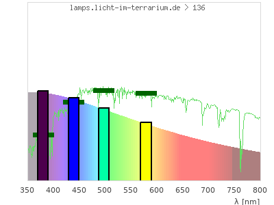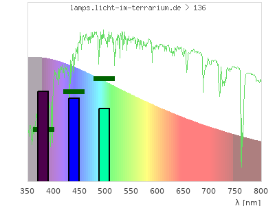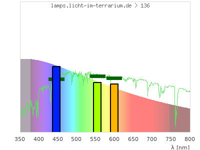 Whereas a spectrometer measures the intensity in every tiny wavelength interval resulting in thousands of individual intensities, the human eye only measures three intensities detected by the three cones. The same is true for the reptile eye with usually three or four photoreceptors. Effectively the detailled spectrum displayed above reduces to a much compacter bar graph displayed below. The photoreceptor sensitivites from these L-Cone, M-Cone, S-Cone, and U-Cone are used, they are chosen as an average of measured reptile photoreceptor sensitivity curves. The bar graph also shows as reference the intensity seen by the three or four photoreceptors for average sunlight (id 1).