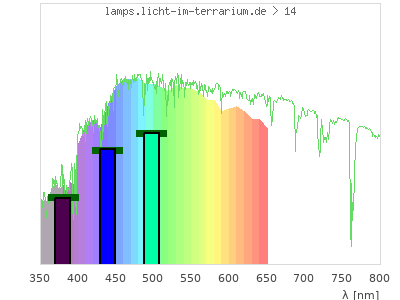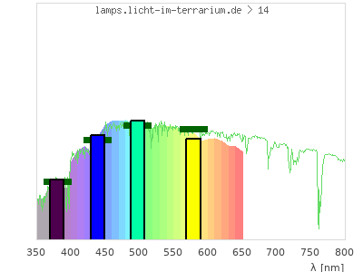 total ( 0 nm - 0 nm) 13700 µW/cm² = 137 W/m² UVC ( 0 nm - 280 nm) 0 µW/cm² = 0 W/m² non-terrestrial ( 0 nm - 290 nm) 0 µW/cm² = 0 W/m² total2 ( 250 nm - 880 nm) 13700 µW/cm² = 137 W/m² UVB (EU) ( 280 nm - 315 nm) 22.8 µW/cm² = 0.228 W/m² UVB (US) ( 280 nm - 320 nm) 46.9 µW/cm² = 0.469 W/m² UVA+B ( 280 nm - 380 nm) 1110 µW/cm² = 11.1 W/m² Solar UVB ( 290 nm - 315 nm) 22.8 µW/cm² = 0.228 W/m² UVA D3 regulating ( 315 nm - 335 nm) 227 µW/cm² = 2.27 W/m² UVA (EU) ( 315 nm - 380 nm) 1090 µW/cm² = 10.9 W/m² UVA2 (medical definition) ( 320 nm - 340 nm) 264 µW/cm² = 2.64 W/m² UVA (US) ( 320 nm - 380 nm) 1070 µW/cm² = 10.7 W/m² UVA1 (variant) ( 335 nm - 380 nm) 863 µW/cm² = 8.63 W/m² UVA1 (medical) ( 340 nm - 400 nm) 1290 µW/cm² = 12.9 W/m² vis. UVA ( 350 nm - 380 nm) 631 µW/cm² = 6.31 W/m² VIS Rep3 ( 350 nm - 600 nm) 11000 µW/cm² = 110 W/m² VIS Rep4 ( 350 nm - 700 nm) 13200 µW/cm² = 132 W/m² purple ( 380 nm - 420 nm) 1280 µW/cm² = 12.8 W/m² VIS ( 380 nm - 780 nm) 12600 µW/cm² = 126 W/m² VIS2 ( 400 nm - 680 nm) 12100 µW/cm² = 121 W/m² PAR ( 400 nm - 700 nm) 12100 µW/cm² = 121 W/m² tmp ( 400 nm - 1100 nm) 12100 µW/cm² = 121 W/m² blue ( 420 nm - 490 nm) 3520 µW/cm² = 35.2 W/m² green ( 490 nm - 575 nm) 4640 µW/cm² = 46.4 W/m² yellow ( 575 nm - 585 nm) 469 µW/cm² = 4.69 W/m² orange ( 585 nm - 650 nm) 2670 µW/cm² = 26.7 W/m² red ( 650 nm - 780 nm) 0 µW/cm² = 0 W/m² IRA ( 700 nm - 1400 nm) 0 µW/cm² = 0 W/m² IR2 ( 720 nm - 1100 nm) 0 µW/cm² = 0 W/m² IRB ( 1400 nm - 3000 nm) 0 µW/cm² = 0 W/m²