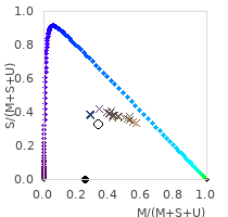 From these three numbers the colour coordinate and the correlated colour temperature for humans are calculated using the CIE standard method. I adapted this concept to a "3 cone reptile (M,S,U)" and a "4 cone reptile (L,M,S,U)". I am sure, that this adaption to other colour spaces makes sense mathematically and this is also done in scientific research regarding colour vision of animals, however I have not seen calculation of colour temperatures for other animals in the scientific literature. Even if it is hypothetical, at least this shows, how arbitrary the colour temperature is, and that the colour temperature calculated for humans does not apply to reptiles. The colour spaces also show the colour coordinates of different phases of daylight ((ids 1, 338 – 451, 511 – 513 ), indicated by crosses, coloured in the appriximate colour perceived by a human.