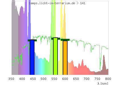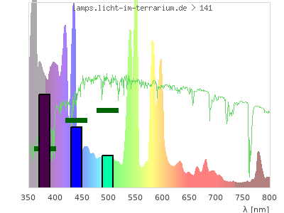 Whereas a spectrometer measures the intensity in every tiny wavelength interval resulting in thousands of individual intensities, the human eye only measures three intensities detected by the three cones. The same is true for the reptile eye with usually three or four photoreceptors. Effectively the detailled spectrum displayed above reduces to a much compacter bar graph displayed below. The photoreceptor sensitivites from these L-Cone, M-Cone, S-Cone, and U-Cone are used, they are chosen as an average of measured reptile photoreceptor sensitivity curves. The bar graph also shows as reference the intensity seen by the three or four photoreceptors for average sunlight (id 1).