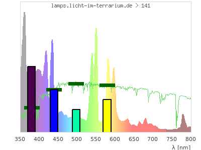 total ( 0 nm - 0 nm) 103 µW/cm² = 1.03 W/m² UVC ( 0 nm - 280 nm) 0 µW/cm² = 0 W/m² non-terrestrial ( 0 nm - 290 nm) 0 µW/cm² = 0 W/m² total2 ( 250 nm - 880 nm) 103 µW/cm² = 1.03 W/m² UVB (EU) ( 280 nm - 315 nm) 0.218 µW/cm² = 0.00218 W/m² UVB (US) ( 280 nm - 320 nm) 0.384 µW/cm² = 0.00384 W/m² UVA+B ( 280 nm - 380 nm) 24.7 µW/cm² = 0.247 W/m² Solar UVB ( 290 nm - 315 nm) 0.218 µW/cm² = 0.00218 W/m² UVA D3 regulating ( 315 nm - 335 nm) 1.55 µW/cm² = 0.0155 W/m² UVA (EU) ( 315 nm - 380 nm) 24.5 µW/cm² = 0.245 W/m² UVA2 (medical definition) ( 320 nm - 340 nm) 2.49 µW/cm² = 0.0249 W/m² UVA (US) ( 320 nm - 380 nm) 24.3 µW/cm² = 0.243 W/m² UVA1 (variant) ( 335 nm - 380 nm) 22.9 µW/cm² = 0.229 W/m² UVA1 (medical) ( 340 nm - 400 nm) 30.7 µW/cm² = 0.307 W/m² vis. UVA ( 350 nm - 380 nm) 18.2 µW/cm² = 0.182 W/m² VIS Rep3 ( 350 nm - 600 nm) 83.6 µW/cm² = 0.836 W/m² VIS Rep4 ( 350 nm - 700 nm) 91.9 µW/cm² = 0.919 W/m² purple ( 380 nm - 420 nm) 19 µW/cm² = 0.19 W/m² VIS ( 380 nm - 780 nm) 76.5 µW/cm² = 0.765 W/m² VIS2 ( 400 nm - 680 nm) 63.5 µW/cm² = 0.635 W/m² PAR ( 400 nm - 700 nm) 64.9 µW/cm² = 0.649 W/m² tmp ( 400 nm - 1100 nm) 69.8 µW/cm² = 0.698 W/m² blue ( 420 nm - 490 nm) 16.2 µW/cm² = 0.162 W/m² green ( 490 nm - 575 nm) 19.5 µW/cm² = 0.195 W/m² yellow ( 575 nm - 585 nm) 4.67 µW/cm² = 0.0467 W/m² orange ( 585 nm - 650 nm) 11 µW/cm² = 0.11 W/m² red ( 650 nm - 780 nm) 6.22 µW/cm² = 0.0622 W/m² IRA ( 700 nm - 1400 nm) 4.91 µW/cm² = 0.0491 W/m² IR2 ( 720 nm - 1100 nm) 4.16 µW/cm² = 0.0416 W/m² IRB ( 1400 nm - 3000 nm) 0 µW/cm² = 0 W/m²