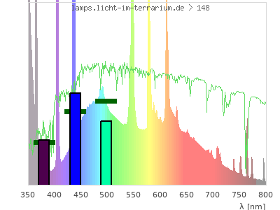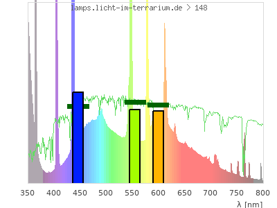 Whereas a spectrometer measures the intensity in every tiny wavelength interval resulting in thousands of individual intensities, the human eye only measures three intensities detected by the three cones. The same is true for the reptile eye with usually three or four photoreceptors. Effectively the detailled spectrum displayed above reduces to a much compacter bar graph displayed below. The photoreceptor sensitivites from these L-Cone, M-Cone, S-Cone, and U-Cone are used, they are chosen as an average of measured reptile photoreceptor sensitivity curves. The bar graph also shows as reference the intensity seen by the three or four photoreceptors for average sunlight (id 1).