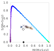 From these three numbers the colour coordinate and the correlated colour temperature for humans are calculated using the CIE standard method. I adapted this concept to a "3 cone reptile (M,S,U)" and a "4 cone reptile (L,M,S,U)". I am sure, that this adaption to other colour spaces makes sense mathematically and this is also done in scientific research regarding colour vision of animals, however I have not seen calculation of colour temperatures for other animals in the scientific literature. Even if it is hypothetical, at least this shows, how arbitrary the colour temperature is, and that the colour temperature calculated for humans does not apply to reptiles. The colour spaces also show the colour coordinates of different phases of daylight ((ids 1, 338 – 451, 511 – 513 ), indicated by crosses, coloured in the appriximate colour perceived by a human.