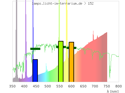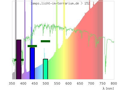 total ( 0 nm - 0 nm) 1860 µW/cm² = 18.6 W/m² UVC ( 0 nm - 280 nm) 1 µW/cm² = 0.01 W/m² non-terrestrial ( 0 nm - 290 nm) 2.97 µW/cm² = 0.0297 W/m² total2 ( 250 nm - 880 nm) 1860 µW/cm² = 18.6 W/m² UVB (EU) ( 280 nm - 315 nm) 87.5 µW/cm² = 0.875 W/m² UVB (US) ( 280 nm - 320 nm) 91.6 µW/cm² = 0.916 W/m² UVA+B ( 280 nm - 380 nm) 303 µW/cm² = 3.03 W/m² Solar UVB ( 290 nm - 315 nm) 85.5 µW/cm² = 0.855 W/m² UVA D3 regulating ( 315 nm - 335 nm) 17.6 µW/cm² = 0.176 W/m² UVA (EU) ( 315 nm - 380 nm) 215 µW/cm² = 2.15 W/m² UVA2 (medical definition) ( 320 nm - 340 nm) 19.1 µW/cm² = 0.191 W/m² UVA (US) ( 320 nm - 380 nm) 211 µW/cm² = 2.11 W/m² UVA1 (variant) ( 335 nm - 380 nm) 198 µW/cm² = 1.98 W/m² UVA1 (medical) ( 340 nm - 400 nm) 201 µW/cm² = 2.01 W/m² vis. UVA ( 350 nm - 380 nm) 187 µW/cm² = 1.87 W/m² VIS Rep3 ( 350 nm - 600 nm) 1000 µW/cm² = 10 W/m² VIS Rep4 ( 350 nm - 700 nm) 1450 µW/cm² = 14.5 W/m² purple ( 380 nm - 420 nm) 80.3 µW/cm² = 0.803 W/m² VIS ( 380 nm - 780 nm) 1560 µW/cm² = 15.6 W/m² VIS2 ( 400 nm - 680 nm) 1140 µW/cm² = 11.4 W/m² PAR ( 400 nm - 700 nm) 1250 µW/cm² = 12.5 W/m² tmp ( 400 nm - 1100 nm) 1550 µW/cm² = 15.5 W/m² blue ( 420 nm - 490 nm) 184 µW/cm² = 1.84 W/m² green ( 490 nm - 575 nm) 311 µW/cm² = 3.11 W/m² yellow ( 575 nm - 585 nm) 191 µW/cm² = 1.91 W/m² orange ( 585 nm - 650 nm) 240 µW/cm² = 2.4 W/m² red ( 650 nm - 780 nm) 550 µW/cm² = 5.5 W/m² IRA ( 700 nm - 1400 nm) 298 µW/cm² = 2.98 W/m² IR2 ( 720 nm - 1100 nm) 185 µW/cm² = 1.85 W/m² IRB ( 1400 nm - 3000 nm) 0 µW/cm² = 0 W/m²