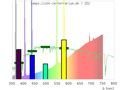Whereas a spectrometer measures the intensity in every tiny wavelength interval resulting in thousands of individual intensities, the human eye only measures three intensities detected by the three cones. The same is true for the reptile eye with usually three or four photoreceptors. Effectively the detailled spectrum displayed above reduces to a much compacter bar graph displayed below. The photoreceptor sensitivites from these L-Cone, M-Cone, S-Cone, and U-Cone are used, they are chosen as an average of measured reptile photoreceptor sensitivity curves. The bar graph also shows as reference the intensity seen by the three or four photoreceptors for average sunlight (id 1).