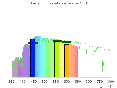 total ( 0 nm - 0 nm) 43300 µW/cm² = 433 W/m² UVC ( 0 nm - 280 nm) 0 µW/cm² = 0 W/m² non-terrestrial ( 0 nm - 290 nm) 0 µW/cm² = 0 W/m² total2 ( 250 nm - 880 nm) 43300 µW/cm² = 433 W/m² UVB (EU) ( 280 nm - 315 nm) 210 µW/cm² = 2.1 W/m² UVB (US) ( 280 nm - 320 nm) 336 µW/cm² = 3.36 W/m² UVA+B ( 280 nm - 380 nm) 4260 µW/cm² = 42.6 W/m² Solar UVB ( 290 nm - 315 nm) 210 µW/cm² = 2.1 W/m² UVA D3 regulating ( 315 nm - 335 nm) 947 µW/cm² = 9.47 W/m² UVA (EU) ( 315 nm - 380 nm) 4050 µW/cm² = 40.5 W/m² UVA2 (medical definition) ( 320 nm - 340 nm) 1050 µW/cm² = 10.5 W/m² UVA (US) ( 320 nm - 380 nm) 3920 µW/cm² = 39.2 W/m² UVA1 (variant) ( 335 nm - 380 nm) 3100 µW/cm² = 31 W/m² UVA1 (medical) ( 340 nm - 400 nm) 4530 µW/cm² = 45.3 W/m² vis. UVA ( 350 nm - 380 nm) 2250 µW/cm² = 22.5 W/m² VIS Rep3 ( 350 nm - 600 nm) 34500 µW/cm² = 345 W/m² VIS Rep4 ( 350 nm - 700 nm) 41300 µW/cm² = 413 W/m² purple ( 380 nm - 420 nm) 4280 µW/cm² = 42.8 W/m² VIS ( 380 nm - 780 nm) 39000 µW/cm² = 390 W/m² VIS2 ( 400 nm - 680 nm) 37400 µW/cm² = 374 W/m² PAR ( 400 nm - 700 nm) 37400 µW/cm² = 374 W/m² tmp ( 400 nm - 1100 nm) 37400 µW/cm² = 374 W/m² blue ( 420 nm - 490 nm) 11000 µW/cm² = 110 W/m² green ( 490 nm - 575 nm) 14100 µW/cm² = 141 W/m² yellow ( 575 nm - 585 nm) 1460 µW/cm² = 14.6 W/m² orange ( 585 nm - 650 nm) 8160 µW/cm² = 81.6 W/m² red ( 650 nm - 780 nm) 0 µW/cm² = 0 W/m² IRA ( 700 nm - 1400 nm) 0 µW/cm² = 0 W/m² IR2 ( 720 nm - 1100 nm) 0 µW/cm² = 0 W/m² IRB ( 1400 nm - 3000 nm) 0 µW/cm² = 0 W/m²