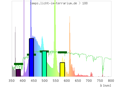 Whereas a spectrometer measures the intensity in every tiny wavelength interval resulting in thousands of individual intensities, the human eye only measures three intensities detected by the three cones. The same is true for the reptile eye with usually three or four photoreceptors. Effectively the detailled spectrum displayed above reduces to a much compacter bar graph displayed below. The photoreceptor sensitivites from these L-Cone, M-Cone, S-Cone, and U-Cone are used, they are chosen as an average of measured reptile photoreceptor sensitivity curves. The bar graph also shows as reference the intensity seen by the three or four photoreceptors for average sunlight (id 1).