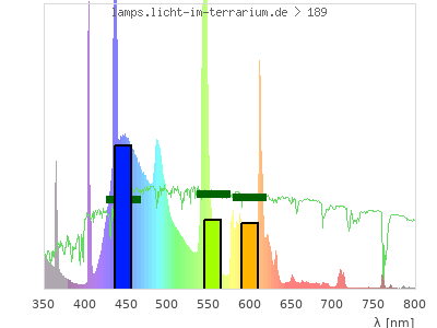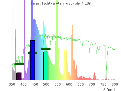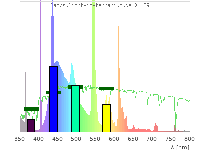 total ( 0 nm - 0 nm) 764 µW/cm² = 7.64 W/m² UVC ( 0 nm - 280 nm) 1.93 µW/cm² = 0.0193 W/m² non-terrestrial ( 0 nm - 290 nm) 2.69 µW/cm² = 0.0269 W/m² total2 ( 250 nm - 880 nm) 764 µW/cm² = 7.64 W/m² UVB (EU) ( 280 nm - 315 nm) 32 µW/cm² = 0.32 W/m² UVB (US) ( 280 nm - 320 nm) 47 µW/cm² = 0.47 W/m² UVA+B ( 280 nm - 380 nm) 133 µW/cm² = 1.33 W/m² Solar UVB ( 290 nm - 315 nm) 31.2 µW/cm² = 0.312 W/m² UVA D3 regulating ( 315 nm - 335 nm) 53.8 µW/cm² = 0.538 W/m² UVA (EU) ( 315 nm - 380 nm) 101 µW/cm² = 1.01 W/m² UVA2 (medical definition) ( 320 nm - 340 nm) 48.4 µW/cm² = 0.484 W/m² UVA (US) ( 320 nm - 380 nm) 85.6 µW/cm² = 0.856 W/m² UVA1 (variant) ( 335 nm - 380 nm) 46.8 µW/cm² = 0.468 W/m² UVA1 (medical) ( 340 nm - 400 nm) 40.3 µW/cm² = 0.403 W/m² vis. UVA ( 350 nm - 380 nm) 24.1 µW/cm² = 0.241 W/m² VIS Rep3 ( 350 nm - 600 nm) 580 µW/cm² = 5.8 W/m² VIS Rep4 ( 350 nm - 700 nm) 641 µW/cm² = 6.41 W/m² purple ( 380 nm - 420 nm) 29.3 µW/cm² = 0.293 W/m² VIS ( 380 nm - 780 nm) 624 µW/cm² = 6.24 W/m² VIS2 ( 400 nm - 680 nm) 611 µW/cm² = 6.11 W/m² PAR ( 400 nm - 700 nm) 614 µW/cm² = 6.14 W/m² tmp ( 400 nm - 1100 nm) 627 µW/cm² = 6.27 W/m² blue ( 420 nm - 490 nm) 296 µW/cm² = 2.96 W/m² green ( 490 nm - 575 nm) 196 µW/cm² = 1.96 W/m² yellow ( 575 nm - 585 nm) 17.4 µW/cm² = 0.174 W/m² orange ( 585 nm - 650 nm) 70.2 µW/cm² = 0.702 W/m² red ( 650 nm - 780 nm) 15.6 µW/cm² = 0.156 W/m² IRA ( 700 nm - 1400 nm) 13 µW/cm² = 0.13 W/m² IR2 ( 720 nm - 1100 nm) 8.8 µW/cm² = 0.088 W/m² IRB ( 1400 nm - 3000 nm) 0 µW/cm² = 0 W/m²