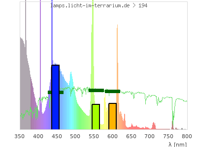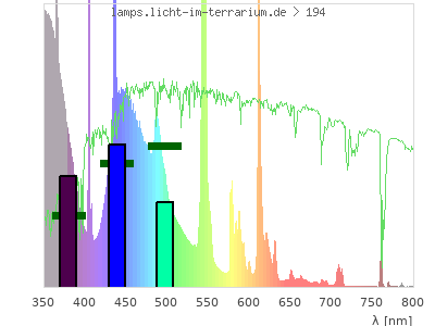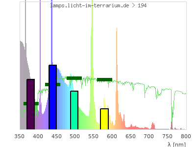Whereas a spectrometer measures the intensity in every tiny wavelength interval resulting in thousands of individual intensities, the human eye only measures three intensities detected by the three cones. The same is true for the reptile eye with usually three or four photoreceptors. Effectively the detailled spectrum displayed above reduces to a much compacter bar graph displayed below. The photoreceptor sensitivites from these L-Cone, M-Cone, S-Cone, and U-Cone are used, they are chosen as an average of measured reptile photoreceptor sensitivity curves. The bar graph also shows as reference the intensity seen by the three or four photoreceptors for average sunlight (id 1).