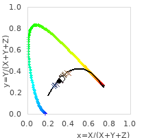 From these three numbers the colour coordinate and the correlated colour temperature for humans are calculated using the CIE standard method. I adapted this concept to a "3 cone reptile (M,S,U)" and a "4 cone reptile (L,M,S,U)". I am sure, that this adaption to other colour spaces makes sense mathematically and this is also done in scientific research regarding colour vision of animals, however I have not seen calculation of colour temperatures for other animals in the scientific literature. Even if it is hypothetical, at least this shows, how arbitrary the colour temperature is, and that the colour temperature calculated for humans does not apply to reptiles. The colour spaces also show the colour coordinates of different phases of daylight ((ids 1, 338 – 451, 511 – 513 ), indicated by crosses, coloured in the appriximate colour perceived by a human.