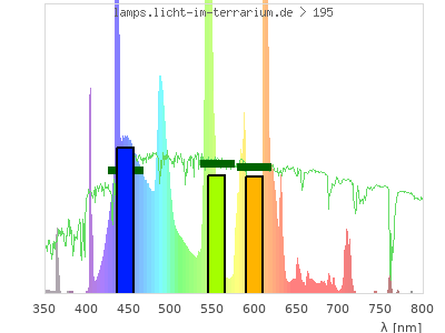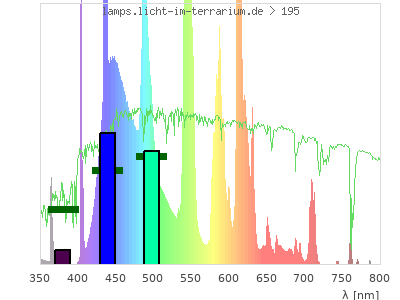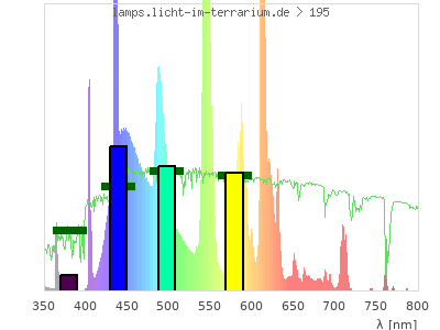 total ( 0 nm - 0 nm) 908 µW/cm² = 9.08 W/m² UVC ( 0 nm - 280 nm) 0 µW/cm² = 0 W/m² non-terrestrial ( 0 nm - 290 nm) 0 µW/cm² = 0 W/m² total2 ( 250 nm - 880 nm) 908 µW/cm² = 9.08 W/m² UVB (EU) ( 280 nm - 315 nm) 1.48 µW/cm² = 0.0148 W/m² UVB (US) ( 280 nm - 320 nm) 2.13 µW/cm² = 0.0213 W/m² UVA+B ( 280 nm - 380 nm) 12.7 µW/cm² = 0.127 W/m² Solar UVB ( 290 nm - 315 nm) 1.48 µW/cm² = 0.0148 W/m² UVA D3 regulating ( 315 nm - 335 nm) 2.99 µW/cm² = 0.0299 W/m² UVA (EU) ( 315 nm - 380 nm) 11.2 µW/cm² = 0.112 W/m² UVA2 (medical definition) ( 320 nm - 340 nm) 3.19 µW/cm² = 0.0319 W/m² UVA (US) ( 320 nm - 380 nm) 10.6 µW/cm² = 0.106 W/m² UVA1 (variant) ( 335 nm - 380 nm) 8.24 µW/cm² = 0.0824 W/m² UVA1 (medical) ( 340 nm - 400 nm) 7.62 µW/cm² = 0.0762 W/m² vis. UVA ( 350 nm - 380 nm) 5.92 µW/cm² = 0.0592 W/m² VIS Rep3 ( 350 nm - 600 nm) 701 µW/cm² = 7.01 W/m² VIS Rep4 ( 350 nm - 700 nm) 882 µW/cm² = 8.82 W/m² purple ( 380 nm - 420 nm) 22.2 µW/cm² = 0.222 W/m² VIS ( 380 nm - 780 nm) 891 µW/cm² = 8.91 W/m² VIS2 ( 400 nm - 680 nm) 870 µW/cm² = 8.7 W/m² PAR ( 400 nm - 700 nm) 876 µW/cm² = 8.76 W/m² tmp ( 400 nm - 1100 nm) 895 µW/cm² = 8.95 W/m² blue ( 420 nm - 490 nm) 312 µW/cm² = 3.12 W/m² green ( 490 nm - 575 nm) 290 µW/cm² = 2.9 W/m² yellow ( 575 nm - 585 nm) 29.3 µW/cm² = 0.293 W/m² orange ( 585 nm - 650 nm) 205 µW/cm² = 2.05 W/m² red ( 650 nm - 780 nm) 33 µW/cm² = 0.33 W/m² IRA ( 700 nm - 1400 nm) 19.5 µW/cm² = 0.195 W/m² IR2 ( 720 nm - 1100 nm) 6.45 µW/cm² = 0.0645 W/m² IRB ( 1400 nm - 3000 nm) 0 µW/cm² = 0 W/m²