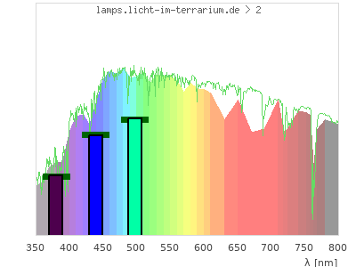 total ( 0 nm - 0 nm) 59300 µW/cm² = 593 W/m² UVC ( 0 nm - 280 nm) 0 µW/cm² = 0 W/m² non-terrestrial ( 0 nm - 290 nm) 0 µW/cm² = 0 W/m² total2 ( 250 nm - 880 nm) 59300 µW/cm² = 593 W/m² UVB (EU) ( 280 nm - 315 nm) 49.1 µW/cm² = 0.491 W/m² UVB (US) ( 280 nm - 320 nm) 121 µW/cm² = 1.21 W/m² UVA+B ( 280 nm - 380 nm) 3020 µW/cm² = 30.2 W/m² Solar UVB ( 290 nm - 315 nm) 49.1 µW/cm² = 0.491 W/m² UVA D3 regulating ( 315 nm - 335 nm) 539 µW/cm² = 5.39 W/m² UVA (EU) ( 315 nm - 380 nm) 2970 µW/cm² = 29.7 W/m² UVA2 (medical definition) ( 320 nm - 340 nm) 671 µW/cm² = 6.71 W/m² UVA (US) ( 320 nm - 380 nm) 2900 µW/cm² = 29 W/m² UVA1 (variant) ( 335 nm - 380 nm) 2430 µW/cm² = 24.3 W/m² UVA1 (medical) ( 340 nm - 400 nm) 3790 µW/cm² = 37.9 W/m² vis. UVA ( 350 nm - 380 nm) 1780 µW/cm² = 17.8 W/m² VIS Rep3 ( 350 nm - 600 nm) 32300 µW/cm² = 323 W/m² VIS Rep4 ( 350 nm - 700 nm) 45400 µW/cm² = 454 W/m² purple ( 380 nm - 420 nm) 3840 µW/cm² = 38.4 W/m² VIS ( 380 nm - 780 nm) 51300 µW/cm² = 513 W/m² VIS2 ( 400 nm - 680 nm) 39700 µW/cm² = 397 W/m² PAR ( 400 nm - 700 nm) 42000 µW/cm² = 420 W/m² tmp ( 400 nm - 1100 nm) 54700 µW/cm² = 547 W/m² blue ( 420 nm - 490 nm) 10100 µW/cm² = 101 W/m² green ( 490 nm - 575 nm) 13700 µW/cm² = 137 W/m² yellow ( 575 nm - 585 nm) 1460 µW/cm² = 14.6 W/m² orange ( 585 nm - 650 nm) 7790 µW/cm² = 77.9 W/m² red ( 650 nm - 780 nm) 14300 µW/cm² = 143 W/m² IRA ( 700 nm - 1400 nm) 12600 µW/cm² = 126 W/m² IR2 ( 720 nm - 1100 nm) 11100 µW/cm² = 111 W/m² IRB ( 1400 nm - 3000 nm) 0 µW/cm² = 0 W/m²
