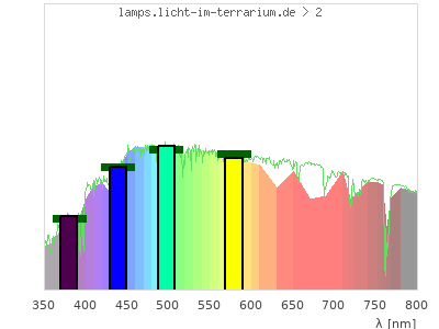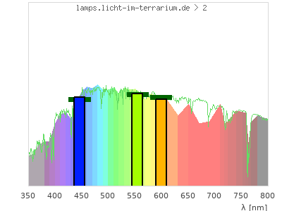 Whereas a spectrometer measures the intensity in every tiny wavelength interval resulting in thousands of individual intensities, the human eye only measures three intensities detected by the three cones. The same is true for the reptile eye with usually three or four photoreceptors. Effectively the detailled spectrum displayed above reduces to a much compacter bar graph displayed below. The photoreceptor sensitivites from these L-Cone, M-Cone, S-Cone, and U-Cone are used, they are chosen as an average of measured reptile photoreceptor sensitivity curves. The bar graph also shows as reference the intensity seen by the three or four photoreceptors for average sunlight (id 1).