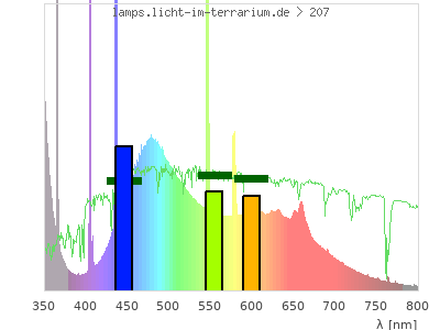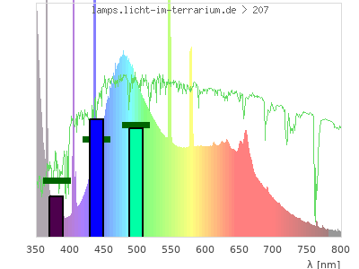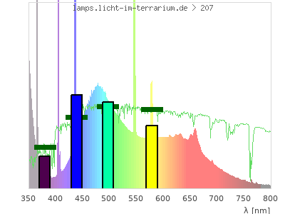 Whereas a spectrometer measures the intensity in every tiny wavelength interval resulting in thousands of individual intensities, the human eye only measures three intensities detected by the three cones. The same is true for the reptile eye with usually three or four photoreceptors. Effectively the detailled spectrum displayed above reduces to a much compacter bar graph displayed below. The photoreceptor sensitivites from these L-Cone, M-Cone, S-Cone, and U-Cone are used, they are chosen as an average of measured reptile photoreceptor sensitivity curves. The bar graph also shows as reference the intensity seen by the three or four photoreceptors for average sunlight (id 1).