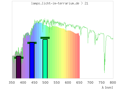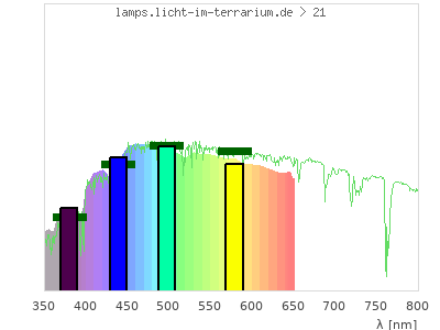 total ( 0 nm - 0 nm) 51600 µW/cm² = 516 W/m² UVC ( 0 nm - 280 nm) 0 µW/cm² = 0 W/m² non-terrestrial ( 0 nm - 290 nm) 0 µW/cm² = 0 W/m² total2 ( 250 nm - 880 nm) 51600 µW/cm² = 516 W/m² UVB (EU) ( 280 nm - 315 nm) 282 µW/cm² = 2.82 W/m² UVB (US) ( 280 nm - 320 nm) 440 µW/cm² = 4.4 W/m² UVA+B ( 280 nm - 380 nm) 5180 µW/cm² = 51.8 W/m² Solar UVB ( 290 nm - 315 nm) 282 µW/cm² = 2.82 W/m² UVA D3 regulating ( 315 nm - 335 nm) 1160 µW/cm² = 11.6 W/m² UVA (EU) ( 315 nm - 380 nm) 4890 µW/cm² = 48.9 W/m² UVA2 (medical definition) ( 320 nm - 340 nm) 1280 µW/cm² = 12.8 W/m² UVA (US) ( 320 nm - 380 nm) 4730 µW/cm² = 47.3 W/m² UVA1 (variant) ( 335 nm - 380 nm) 3730 µW/cm² = 37.3 W/m² UVA1 (medical) ( 340 nm - 400 nm) 5420 µW/cm² = 54.2 W/m² vis. UVA ( 350 nm - 380 nm) 2690 µW/cm² = 26.9 W/m² VIS Rep3 ( 350 nm - 600 nm) 40900 µW/cm² = 409 W/m² VIS Rep4 ( 350 nm - 700 nm) 49100 µW/cm² = 491 W/m² purple ( 380 nm - 420 nm) 5080 µW/cm² = 50.8 W/m² VIS ( 380 nm - 780 nm) 46400 µW/cm² = 464 W/m² VIS2 ( 400 nm - 680 nm) 44500 µW/cm² = 445 W/m² PAR ( 400 nm - 700 nm) 44500 µW/cm² = 445 W/m² tmp ( 400 nm - 1100 nm) 44500 µW/cm² = 445 W/m² blue ( 420 nm - 490 nm) 13000 µW/cm² = 130 W/m² green ( 490 nm - 575 nm) 16600 µW/cm² = 166 W/m² yellow ( 575 nm - 585 nm) 1750 µW/cm² = 17.5 W/m² orange ( 585 nm - 650 nm) 9940 µW/cm² = 99.4 W/m² red ( 650 nm - 780 nm) 0 µW/cm² = 0 W/m² IRA ( 700 nm - 1400 nm) 0 µW/cm² = 0 W/m² IR2 ( 720 nm - 1100 nm) 0 µW/cm² = 0 W/m² IRB ( 1400 nm - 3000 nm) 0 µW/cm² = 0 W/m²