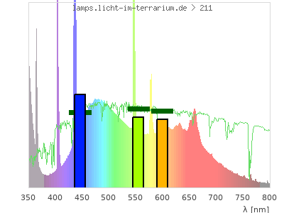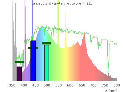 Whereas a spectrometer measures the intensity in every tiny wavelength interval resulting in thousands of individual intensities, the human eye only measures three intensities detected by the three cones. The same is true for the reptile eye with usually three or four photoreceptors. Effectively the detailled spectrum displayed above reduces to a much compacter bar graph displayed below. The photoreceptor sensitivites from these L-Cone, M-Cone, S-Cone, and U-Cone are used, they are chosen as an average of measured reptile photoreceptor sensitivity curves. The bar graph also shows as reference the intensity seen by the three or four photoreceptors for average sunlight (id 1).