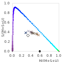 From these three numbers the colour coordinate and the correlated colour temperature for humans are calculated using the CIE standard method. I adapted this concept to a "3 cone reptile (M,S,U)" and a "4 cone reptile (L,M,S,U)". I am sure, that this adaption to other colour spaces makes sense mathematically and this is also done in scientific research regarding colour vision of animals, however I have not seen calculation of colour temperatures for other animals in the scientific literature. Even if it is hypothetical, at least this shows, how arbitrary the colour temperature is, and that the colour temperature calculated for humans does not apply to reptiles. The colour spaces also show the colour coordinates of different phases of daylight ((ids 1, 338 – 451, 511 – 513 ), indicated by crosses, coloured in the appriximate colour perceived by a human.