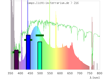 Whereas a spectrometer measures the intensity in every tiny wavelength interval resulting in thousands of individual intensities, the human eye only measures three intensities detected by the three cones. The same is true for the reptile eye with usually three or four photoreceptors. Effectively the detailled spectrum displayed above reduces to a much compacter bar graph displayed below. The photoreceptor sensitivites from these L-Cone, M-Cone, S-Cone, and U-Cone are used, they are chosen as an average of measured reptile photoreceptor sensitivity curves. The bar graph also shows as reference the intensity seen by the three or four photoreceptors for average sunlight (id 1).