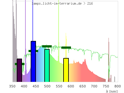 total ( 0 nm - 0 nm) 726 µW/cm² = 7.26 W/m² UVC ( 0 nm - 280 nm) 0 µW/cm² = 0 W/m² non-terrestrial ( 0 nm - 290 nm) 0 µW/cm² = 0 W/m² total2 ( 250 nm - 880 nm) 726 µW/cm² = 7.26 W/m² UVB (EU) ( 280 nm - 315 nm) 38.7 µW/cm² = 0.387 W/m² UVB (US) ( 280 nm - 320 nm) 62.6 µW/cm² = 0.626 W/m² UVA+B ( 280 nm - 380 nm) 291 µW/cm² = 2.91 W/m² Solar UVB ( 290 nm - 315 nm) 38.7 µW/cm² = 0.387 W/m² UVA D3 regulating ( 315 nm - 335 nm) 102 µW/cm² = 1.02 W/m² UVA (EU) ( 315 nm - 380 nm) 252 µW/cm² = 2.52 W/m² UVA2 (medical definition) ( 320 nm - 340 nm) 108 µW/cm² = 1.08 W/m² UVA (US) ( 320 nm - 380 nm) 229 µW/cm² = 2.29 W/m² UVA1 (variant) ( 335 nm - 380 nm) 150 µW/cm² = 1.5 W/m² UVA1 (medical) ( 340 nm - 400 nm) 129 µW/cm² = 1.29 W/m² vis. UVA ( 350 nm - 380 nm) 69.1 µW/cm² = 0.691 W/m² VIS Rep3 ( 350 nm - 600 nm) 391 µW/cm² = 3.91 W/m² VIS Rep4 ( 350 nm - 700 nm) 475 µW/cm² = 4.75 W/m² purple ( 380 nm - 420 nm) 30.8 µW/cm² = 0.308 W/m² VIS ( 380 nm - 780 nm) 423 µW/cm² = 4.23 W/m² VIS2 ( 400 nm - 680 nm) 388 µW/cm² = 3.88 W/m² PAR ( 400 nm - 700 nm) 398 µW/cm² = 3.98 W/m² tmp ( 400 nm - 1100 nm) 426 µW/cm² = 4.26 W/m² blue ( 420 nm - 490 nm) 144 µW/cm² = 1.44 W/m² green ( 490 nm - 575 nm) 120 µW/cm² = 1.2 W/m² yellow ( 575 nm - 585 nm) 13.3 µW/cm² = 0.133 W/m² orange ( 585 nm - 650 nm) 62.4 µW/cm² = 0.624 W/m² red ( 650 nm - 780 nm) 52.8 µW/cm² = 0.528 W/m² IRA ( 700 nm - 1400 nm) 28.7 µW/cm² = 0.287 W/m² IR2 ( 720 nm - 1100 nm) 22.2 µW/cm² = 0.222 W/m² IRB ( 1400 nm - 3000 nm) 0 µW/cm² = 0 W/m²