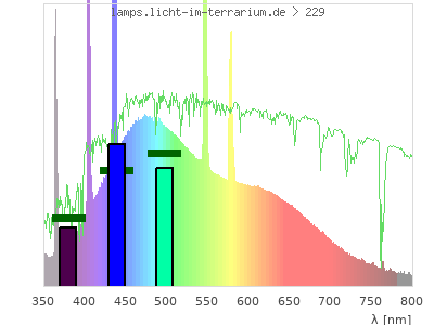 Whereas a spectrometer measures the intensity in every tiny wavelength interval resulting in thousands of individual intensities, the human eye only measures three intensities detected by the three cones. The same is true for the reptile eye with usually three or four photoreceptors. Effectively the detailled spectrum displayed above reduces to a much compacter bar graph displayed below. The photoreceptor sensitivites from these L-Cone, M-Cone, S-Cone, and U-Cone are used, they are chosen as an average of measured reptile photoreceptor sensitivity curves. The bar graph also shows as reference the intensity seen by the three or four photoreceptors for average sunlight (id 1).
