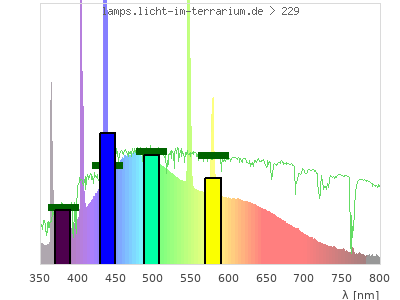 total ( 0 nm - 0 nm) 757 µW/cm² = 7.57 W/m² UVC ( 0 nm - 280 nm) 1.56 µW/cm² = 0.0156 W/m² non-terrestrial ( 0 nm - 290 nm) 3.2 µW/cm² = 0.032 W/m² total2 ( 250 nm - 880 nm) 757 µW/cm² = 7.57 W/m² UVB (EU) ( 280 nm - 315 nm) 71.3 µW/cm² = 0.713 W/m² UVB (US) ( 280 nm - 320 nm) 87.3 µW/cm² = 0.873 W/m² UVA+B ( 280 nm - 380 nm) 148 µW/cm² = 1.48 W/m² Solar UVB ( 290 nm - 315 nm) 69.7 µW/cm² = 0.697 W/m² UVA D3 regulating ( 315 nm - 335 nm) 43.9 µW/cm² = 0.439 W/m² UVA (EU) ( 315 nm - 380 nm) 76.7 µW/cm² = 0.767 W/m² UVA2 (medical definition) ( 320 nm - 340 nm) 32.8 µW/cm² = 0.328 W/m² UVA (US) ( 320 nm - 380 nm) 60.8 µW/cm² = 0.608 W/m² UVA1 (variant) ( 335 nm - 380 nm) 32.8 µW/cm² = 0.328 W/m² UVA1 (medical) ( 340 nm - 400 nm) 42.7 µW/cm² = 0.427 W/m² vis. UVA ( 350 nm - 380 nm) 22.2 µW/cm² = 0.222 W/m² VIS Rep3 ( 350 nm - 600 nm) 487 µW/cm² = 4.87 W/m² VIS Rep4 ( 350 nm - 700 nm) 595 µW/cm² = 5.95 W/m² purple ( 380 nm - 420 nm) 55.6 µW/cm² = 0.556 W/m² VIS ( 380 nm - 780 nm) 601 µW/cm² = 6.01 W/m² VIS2 ( 400 nm - 680 nm) 543 µW/cm² = 5.43 W/m² PAR ( 400 nm - 700 nm) 558 µW/cm² = 5.58 W/m² tmp ( 400 nm - 1100 nm) 593 µW/cm² = 5.93 W/m² blue ( 420 nm - 490 nm) 185 µW/cm² = 1.85 W/m² green ( 490 nm - 575 nm) 181 µW/cm² = 1.81 W/m² yellow ( 575 nm - 585 nm) 22.5 µW/cm² = 0.225 W/m² orange ( 585 nm - 650 nm) 84.8 µW/cm² = 0.848 W/m² red ( 650 nm - 780 nm) 72.1 µW/cm² = 0.721 W/m² IRA ( 700 nm - 1400 nm) 35.2 µW/cm² = 0.352 W/m² IR2 ( 720 nm - 1100 nm) 24.7 µW/cm² = 0.247 W/m² IRB ( 1400 nm - 3000 nm) 0 µW/cm² = 0 W/m²