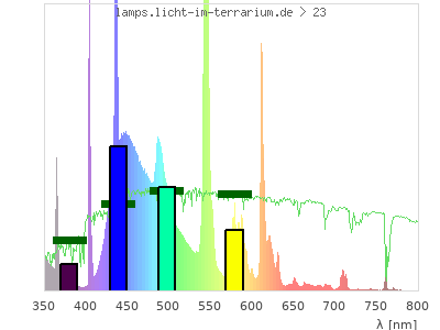 Whereas a spectrometer measures the intensity in every tiny wavelength interval resulting in thousands of individual intensities, the human eye only measures three intensities detected by the three cones. The same is true for the reptile eye with usually three or four photoreceptors. Effectively the detailled spectrum displayed above reduces to a much compacter bar graph displayed below. The photoreceptor sensitivites from these L-Cone, M-Cone, S-Cone, and U-Cone are used, they are chosen as an average of measured reptile photoreceptor sensitivity curves. The bar graph also shows as reference the intensity seen by the three or four photoreceptors for average sunlight (id 1).